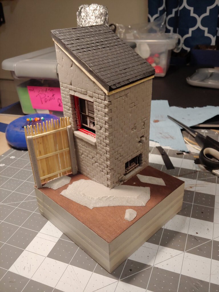 I opted to work in a larger scale to capture some of the mundane details of my abandoned back yard. I built a corner of a brick house using the foamcore. The paper masking from the foamcore was perfect for creating some of the finer details like roof shingles, collapsing gutters, and a vent for a long dead heating system. The windows were made from the glossy cardboard packaging for my bamboo skewers. Those skewers in turn were trimmed, blunted, and flattened to make a classic 1990s American fence. All of this was assembled on top of the pine shadow box flipped upside-down and stained to make a clean display base. A few scraps of foamcore were shaved down with a knife to create natural undulations in the ground. This was an important step, as without it the ground would look unnaturally flat like a video game level.