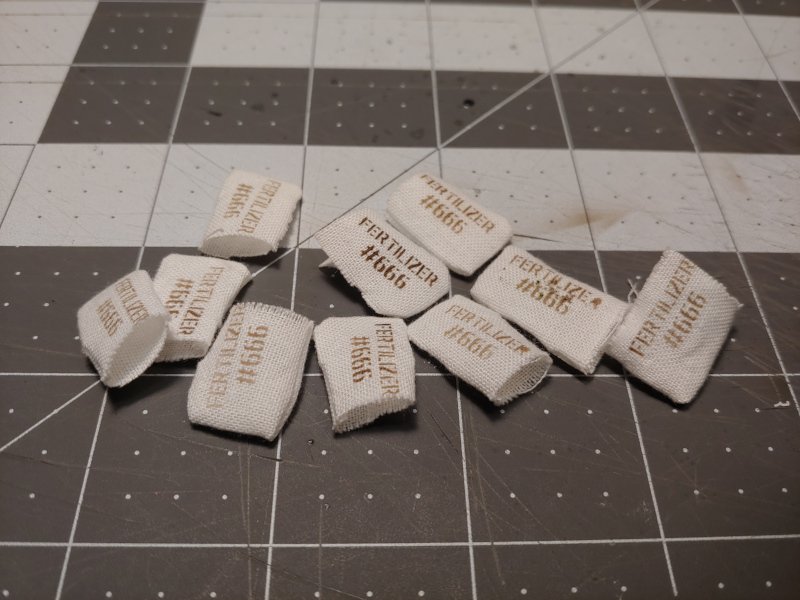 I took a break from the larger structure to make some bags of insidious fertilizer. A thin rectangle of fabric was folded over on itself and glued together with tacky glue. The resulting pillow-case shape was then flipped inside out. A stencil was made on my vinyl cutter, then used to airbrush on the text.