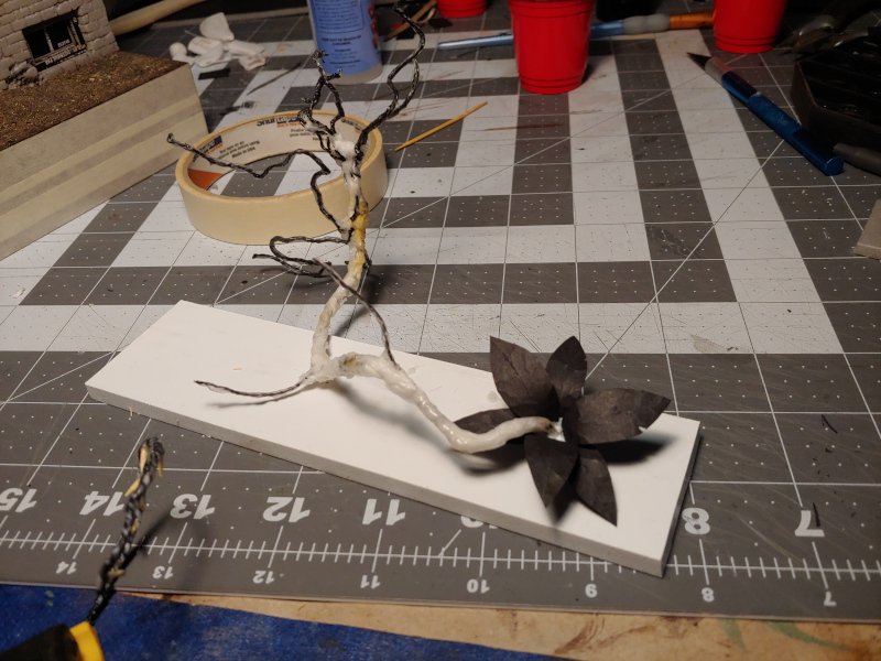 The armature for my demon plant is all twisted floral wire, doubled or even quadrupled up to create a rigid structure. This was covered in PVA glue and a couple of squares of toilet paper on the thicker sections to hide the wire texture.