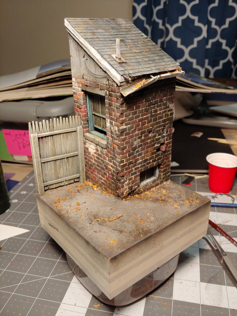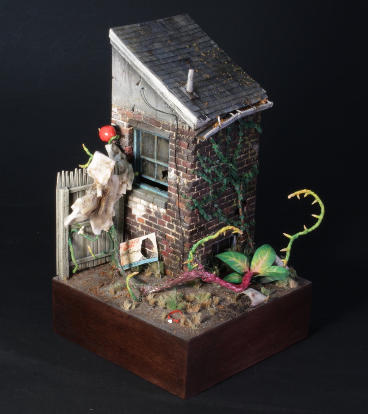 Because scenic work is my specialty, I wanted to focus on more of a diorama aspect than a straight kitbash. I did a quick sketch of a demonic plant hidden in the back yard of a shuttered suburban home, then got to work.