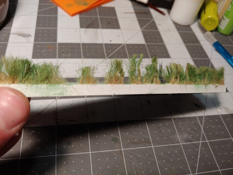 To add grass and keep to my rule of using zero modelling materials (no static grass allowed!) I glued short lengths of my twine to a scrap piece of plastic. I teased the strands apart, then used my airbrush to paint the upper portion green. These were trimmed at an angle with sharp scissors to feather them out and keep the blades of grass from all being the same length.