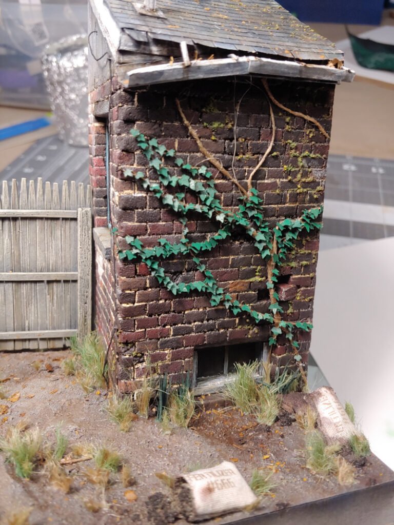 I used the vinyl cutter again to cut hundreds of simple ivy leaves out of the foamcore masking. These were painted with the airbrush with a dark glossy green, then applied one by one using white glue and tweezers.