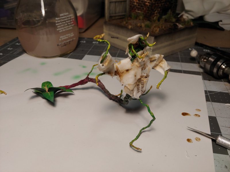The demon plant was painted up with a mix of greens, purples, yellows, and flesh tone. I made a makeshift human disguise for its hungry vine tongue with leftover fertilizer sacks, then weathered them with washes, paint, and dirt.