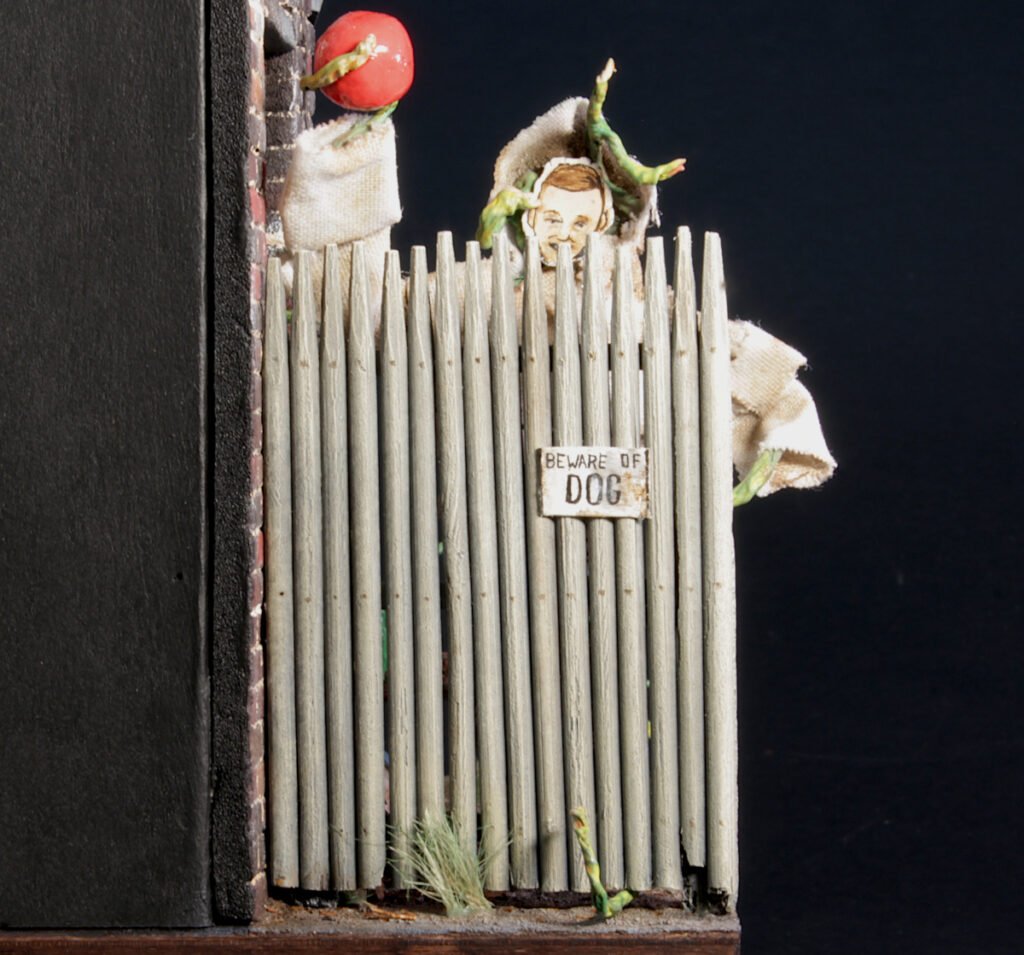I created a few more details like a ‘Beware of Dog’ sign, a looted realtor sign, a mask, and a tempting red ball for my human puppet, and an ominous abandoned dog collar.